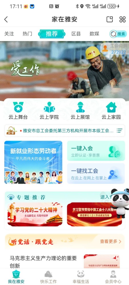 雅安市總工會以川工之家APP“家在雅安”頻道為載體,運用大數(shù)據(jù)、云計算、區(qū)塊鏈、人工智能等新技術,以業(yè)務為基礎,以服務為理念,打造充滿活力的“工”字牌應用場景,構建“智能、便捷、互聯(lián)”的云上數(shù)智化工會服務體系。