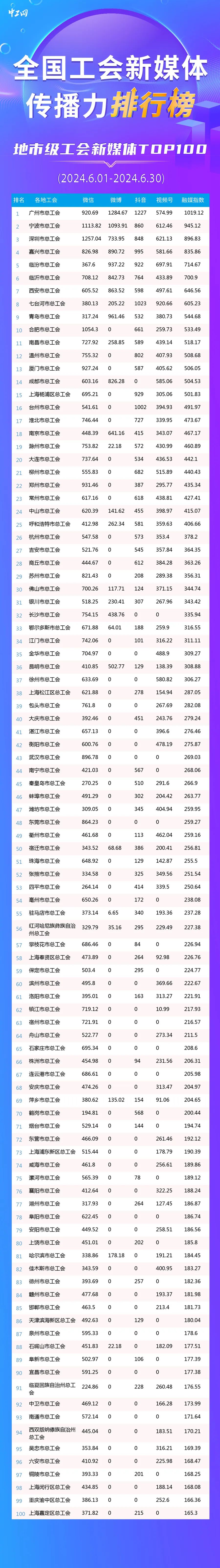 6月全國地市級工會新媒體傳播力TOP100發(fā)布: