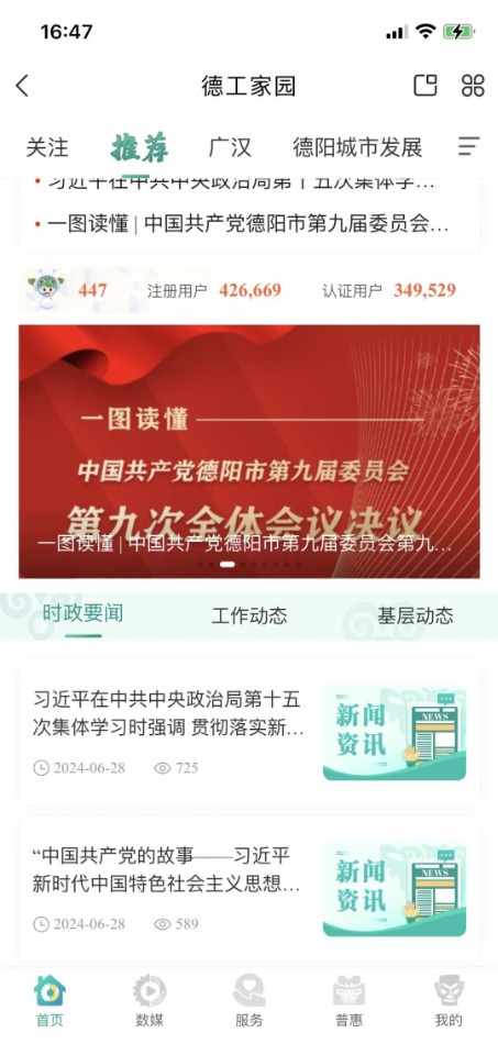 德陽市總工會認真落實全總、省總決策部署要求,在川工之家APP“統分融合”框架下打造“德工家園”頻道。目前“德工家園”頻道注冊用戶超44萬,認證用戶超33萬,累積訪問量超千萬人次。