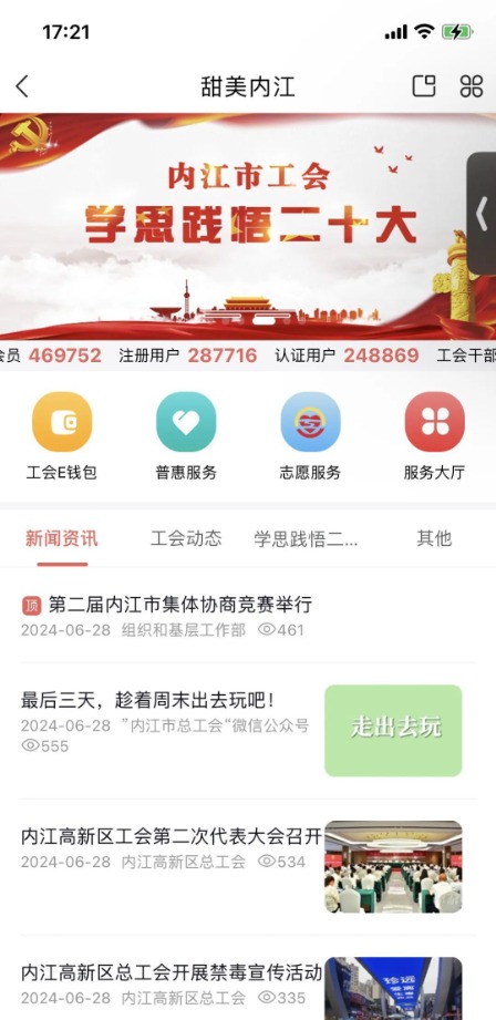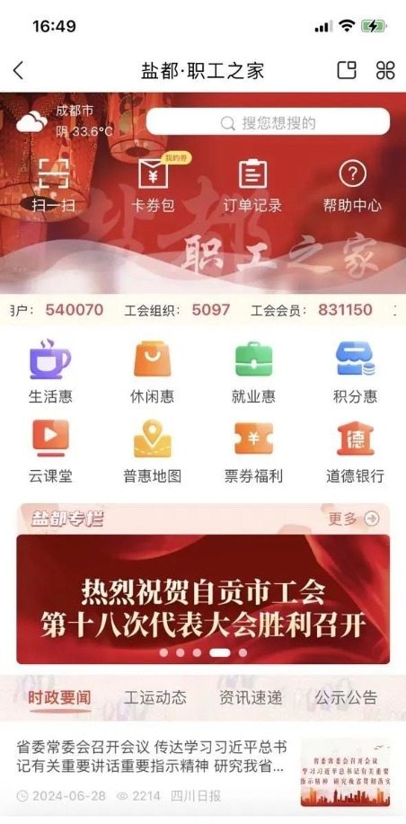 自貢市總工會以“竭誠服務職工群眾”為出發點,以川工之家APP“鹽都職工之家”自貢頻道為載體,聚焦“三個維度”開啟工會數智化服務新征程。頻道自上線發布以來,累計注冊用戶54萬余人,認證用戶45萬余人,發布1.5萬篇信息資訊,普惠服務203個,工會活動108個,職工參與量550萬余人。