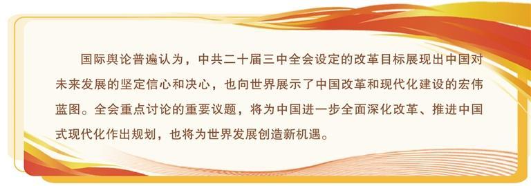 7月15日至18日,中國共產黨第二十屆中央委員會第三次全體會議在北京召開,全會對進一步全面深化改革、推進中國式現代化作出了戰略部署,引起了國際社會廣泛關注。國際輿論普遍認為,中共二十屆三中全會展現了中國繼續推進改革開放的堅定決心,開啟中國式現代化的時代新篇,將為世界發展創造新機遇。