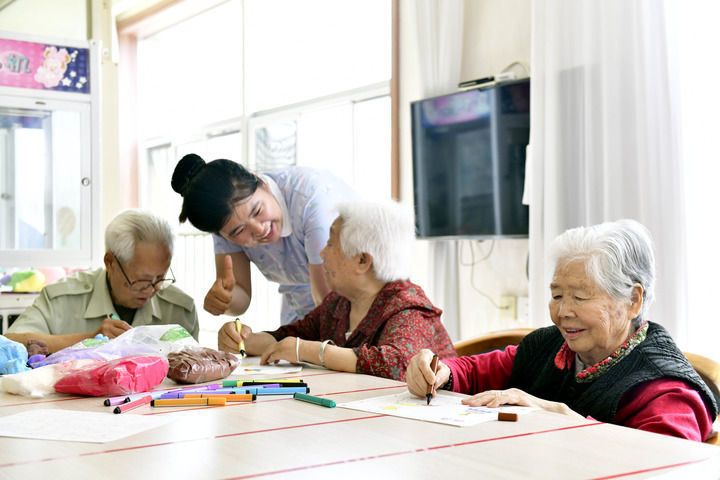 2024年5月25日,在山東省日照市東港區石臼街道日照幸福護理院,老人在工作人員的陪護下做填圖游戲。新華社記者 郭緒雷 攝