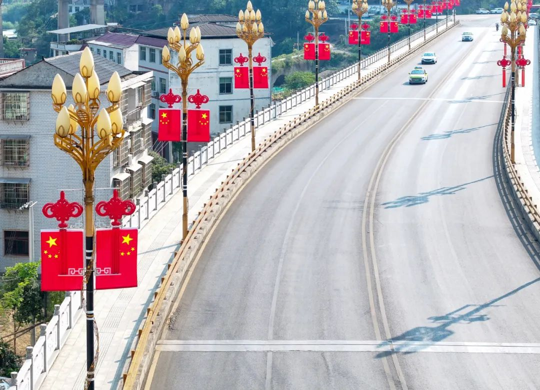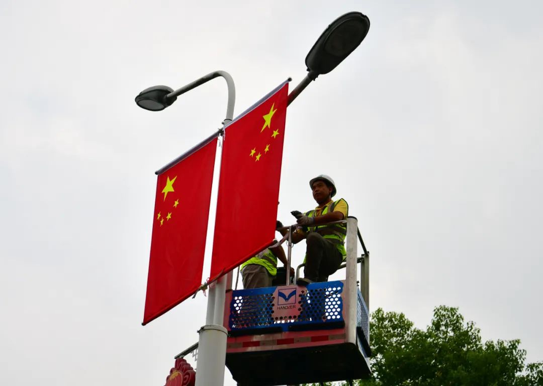 國慶佳節,在三峽庫區湖北省宜昌市秭歸縣茅坪鎮街頭,工人們抓緊時間懸掛國旗,營造出歡樂祥和的喜慶氣氛。
