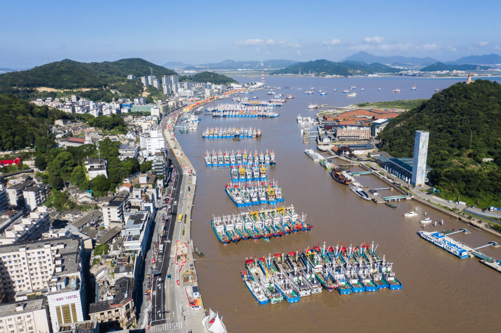 2024年7月31日,在舟山市普陀區沈家門漁港內,漁船靜待開漁(無人機照片)。新華社記者 徐昱 攝