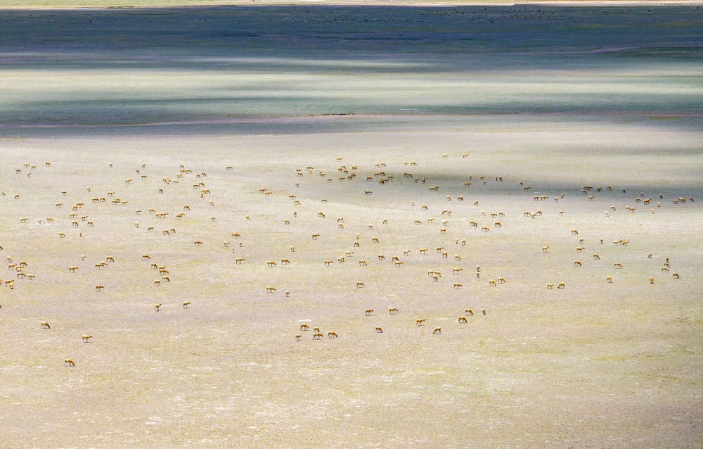 藏羚羊在魯確塘草原集結(無人機照片,2024年6月8日攝)。新華社記者 姜帆 攝