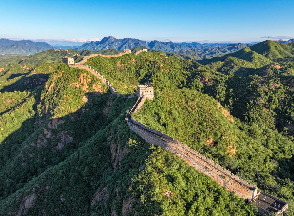 陽光灑在金山嶺長城上(無人機照片,2024年9月21日攝)。新華社記者 陳曄華 攝