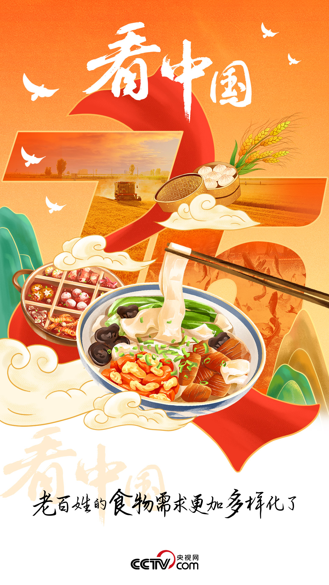 2023年,城鎮居民人均糧食消費量115.6公斤,比1956年下降33.4%,人均豬肉、牛羊肉和蛋類消費量分別比1956年增長3.9倍、2.6倍和3.3倍。2023年,農村居民人均糧食消費量159.8公斤,比1956年下降35.2%,人均豬肉、牛羊肉和蛋類消費量分別比1956年增長9.6倍、2.4倍和21.6倍……百姓餐桌上米面糧食不再是“主角”,肉蛋奶、果菜魚、菌菇筍等原本的副食“閃亮登場”。