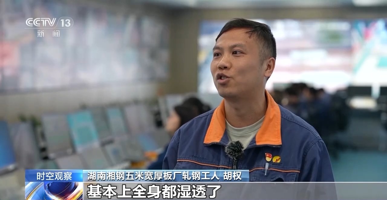 湖南湘鋼五米寬厚板廠軋鋼工人 胡權:在剛進廠的時候,要到軋鋼現場操作臺操作,每當夏季七八月份的時候,到現場去的話,出去幾分鐘,基本上全身都濕透了。