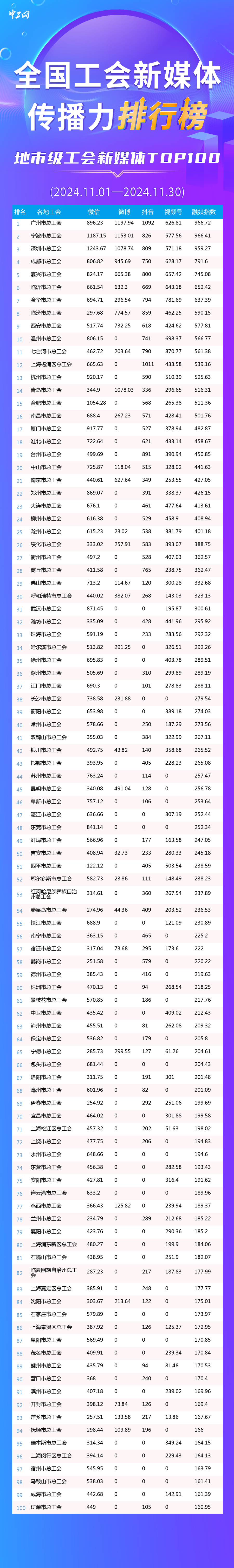 11月全國(guó)地市級(jí)工會(huì)新媒體傳播力TOP100發(fā)布: