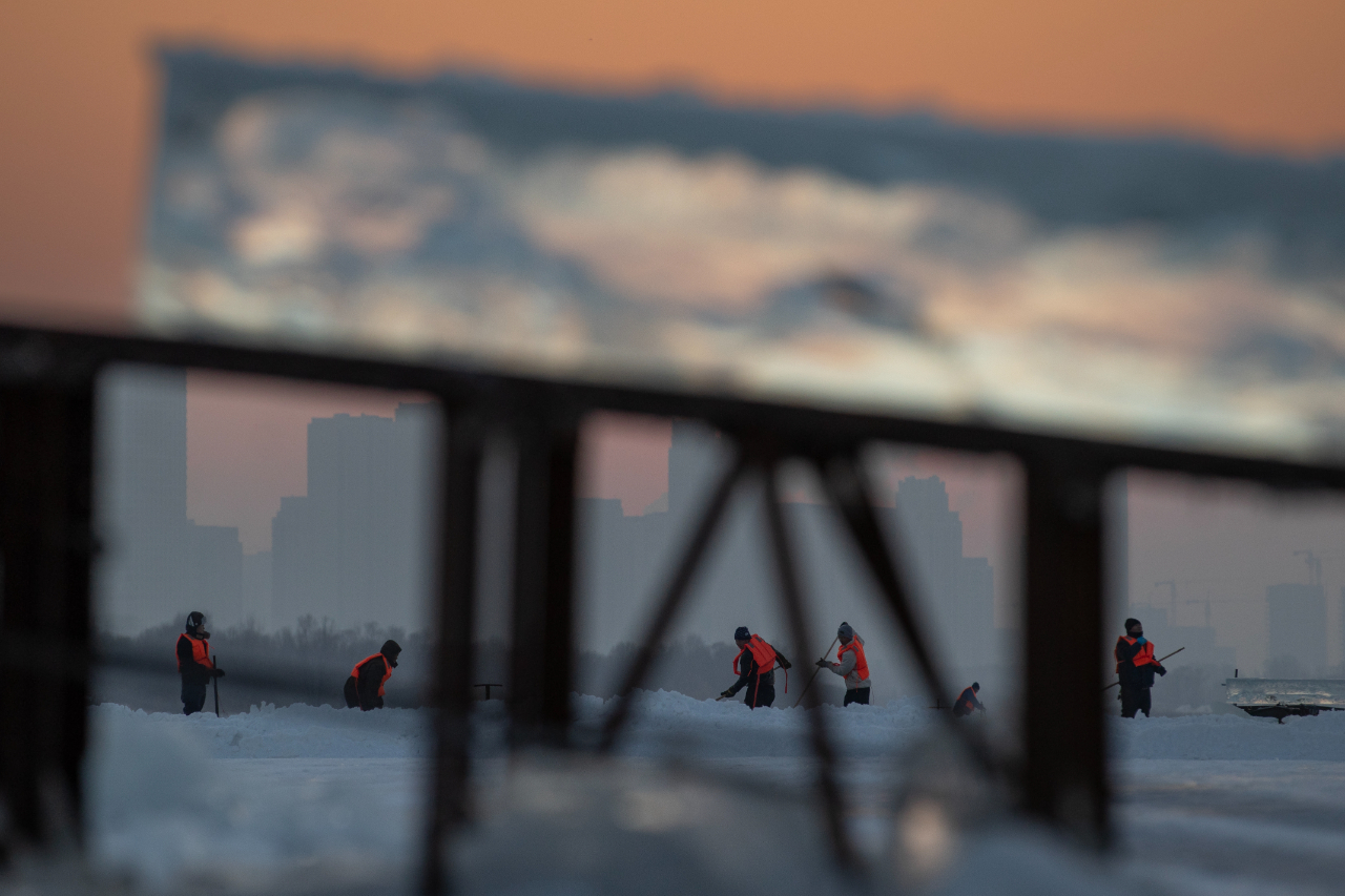 12月9日傍晚,黑龍江哈爾濱松花江面上的采冰人正在作業。
