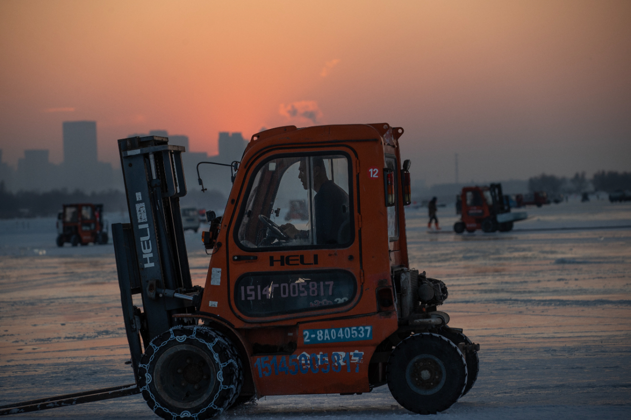 12月9日傍晚,黑龍江哈爾濱松花江面上的采冰人正在用叉車來回運送冰塊。