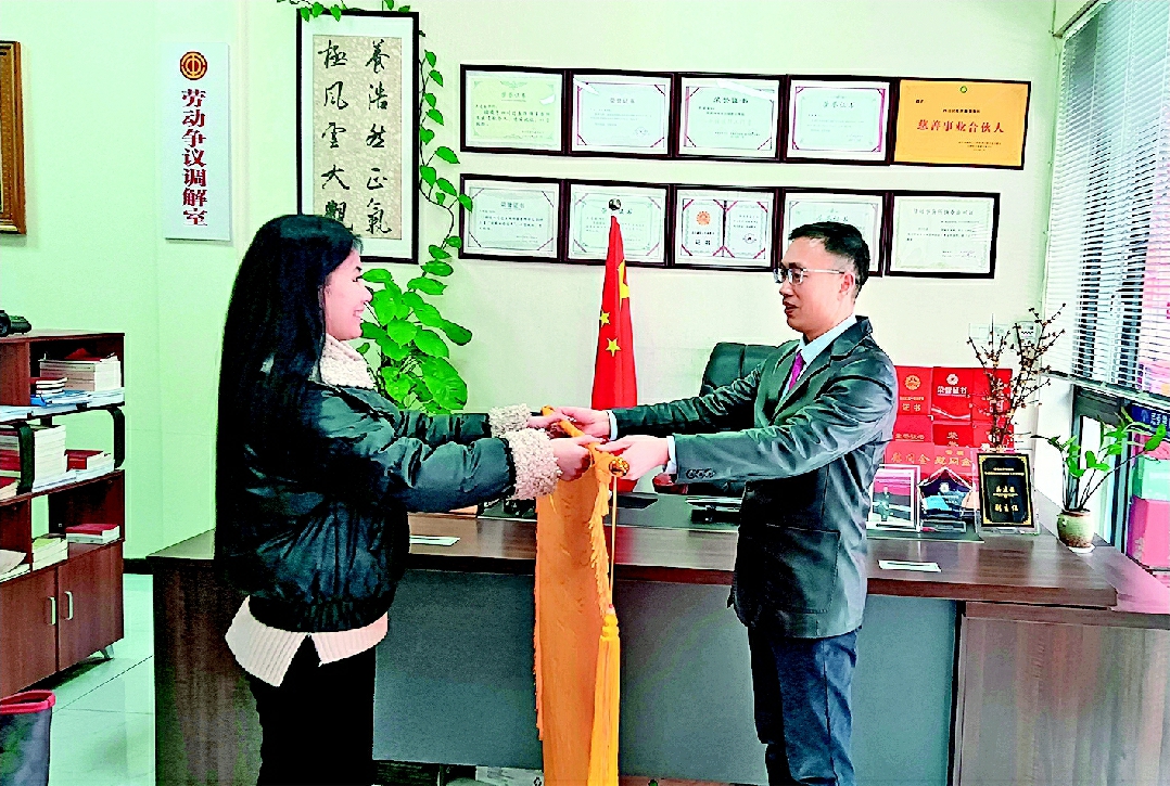 2月6日,四川民愛(ài)律師事務(wù)所內(nèi),工亡農(nóng)民工袁某某之女袁麗(化名,系死者唯一繼承人)在拿到164萬(wàn)余元賠償款后,將一面錦旗送到了工會(huì)律師吳建國(guó)手中,激動(dòng)地表示感謝工會(huì)和律師作為農(nóng)民工的堅(jiān)強(qiáng)后盾,全程協(xié)助她拿回了屬于自己父親的工亡賠償。