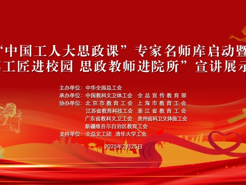 直播回顧丨“中國工人大思政課”專家名師庫啟動暨“勞模工匠進校園 思政教師進院所”宣講展示活動?????為貫徹習近平總書記關于大力弘揚勞模精神、勞動精神、工匠精神和加強新時代學校思政課建設的重要指示,落實全總“559”工作部署,強化產業職工思想政治引領,創新打造“中國工人大思政課”,在以中國式現代化全面推進強國建設、民族復興偉業中發揮工會組織作用,2月25日15:00,“中國工人大思政課”專家名師庫啟動暨“勞模工匠進校園 思政教師進院所”宣講展示活動在清華大學舉辦。中工網首頁、微博、視頻號同步直播。