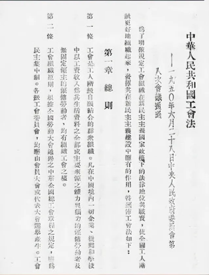 為適應(yīng)建設(shè)統(tǒng)一的全國工會組織的要求,1950年初,在李立三同志的主持下,全國總工會和勞動部組織力量開始《工會法》的起草工作。同年4月21日,政務(wù)院政務(wù)會議通過了《工會法(草案)》,并廣泛征詢各級人民政府和所屬部門,特別是經(jīng)濟部門和工廠企業(yè)管理機關(guān)以及各地工會組織和工商業(yè)者的意見。6月28日,中央人民政府委員會第八次會議通過;6月29日,毛澤東主席簽署發(fā)布中央人民政府令,頒布實施《工會法》。