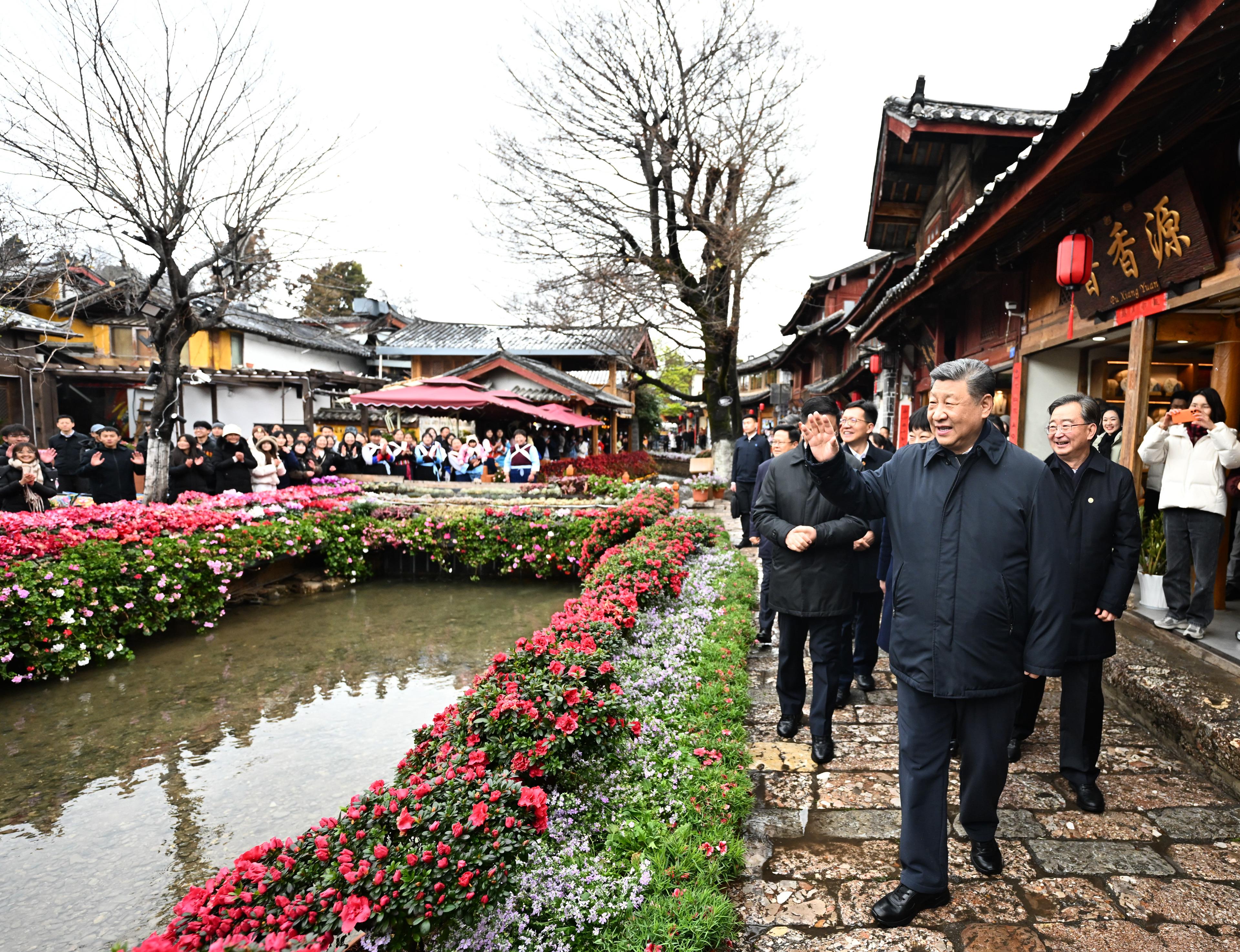 △2025年3月19日,習近平總書記在云南麗江古城考察時,與居民、游客互動交流。