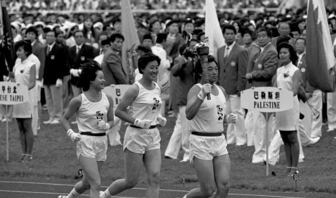 1990年9月22日,北京工人體育場,第十一屆亞運會開幕式,火炬手許海峰、張蓉芳、高敏(前排從右至左)跑入會場。