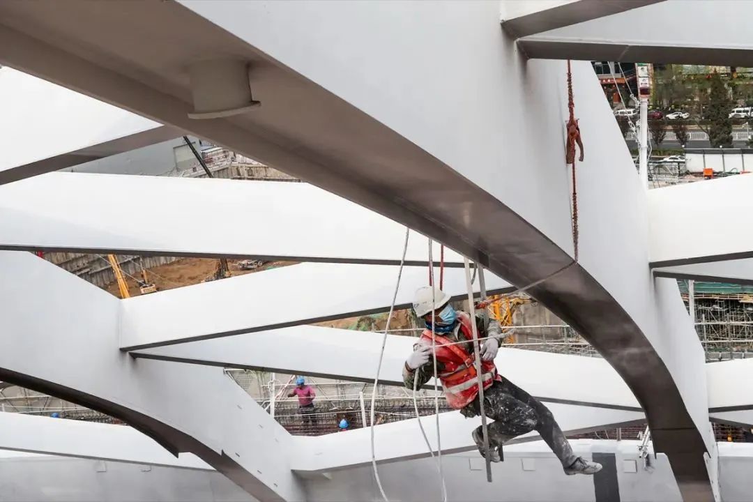 “新工體”場內,“碗形”看臺結構讓觀賽視野更開闊;看臺上,6萬多張“國槐綠”座椅被擦拭一新,黃綠相間的巨大標識“BEIJING FC”格外醒目;上方巨大的環形罩棚集照明、排水、光伏發電、吸聲降噪等多種功能于一體,覆蓋了整個看臺區域。新理念、新技術的應用,讓這座有著60多年歷史的老場館煥發出青春的氣息。場外,橢圓的造型、灰色的外立面、工人迎賓雕塑等,仍保留著工體最初的樣子,在“傳統外觀、現代場館”理念的指引下,工體以熟悉的樣子重生歸來。