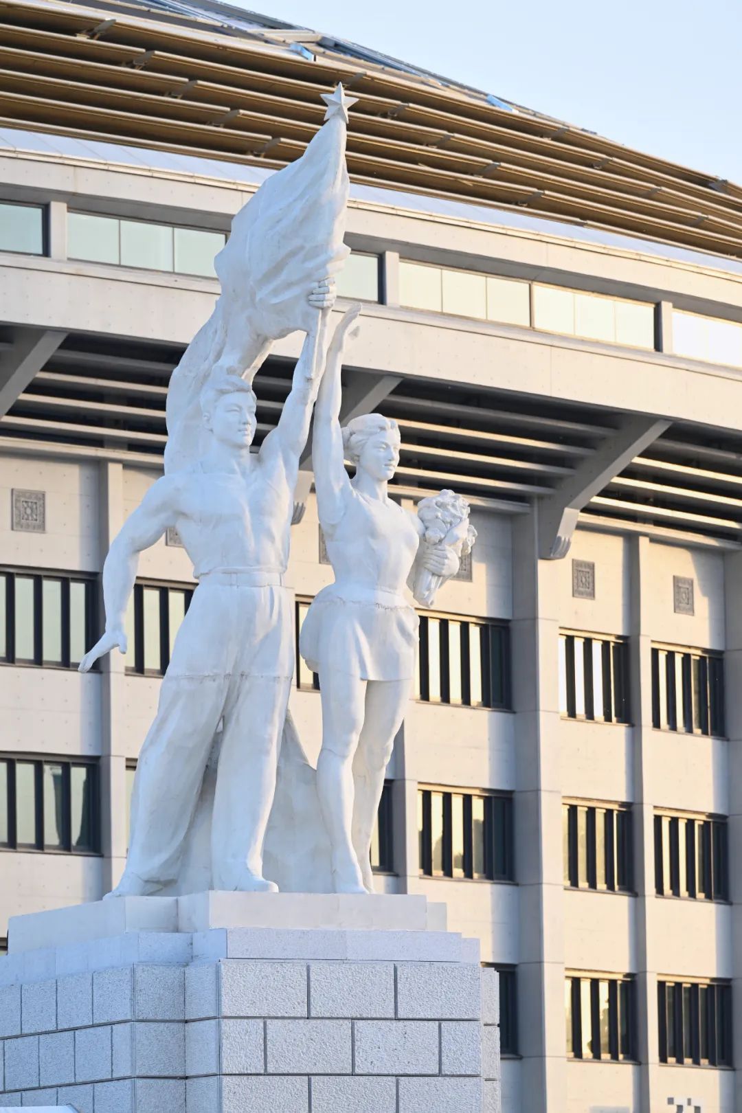 從北門走進“新工體”的廣場,第一眼看到的,就是北廣場正中央1959年落成的男女工人“迎賓”雕塑。