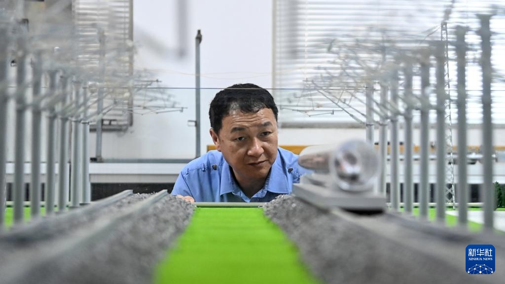 彭春林在工作室對(duì)接觸網(wǎng)作業(yè)車防傾覆裝置的元件進(jìn)行測量(4月22日攝)。新華社記者 張愛林 攝