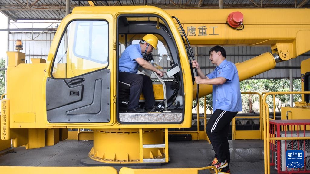 彭春林(左)在柳州動(dòng)力設(shè)備車間檢查接觸網(wǎng)作業(yè)車防傾覆裝置使用情況(4月25日攝)。新華社記者 張愛林 攝