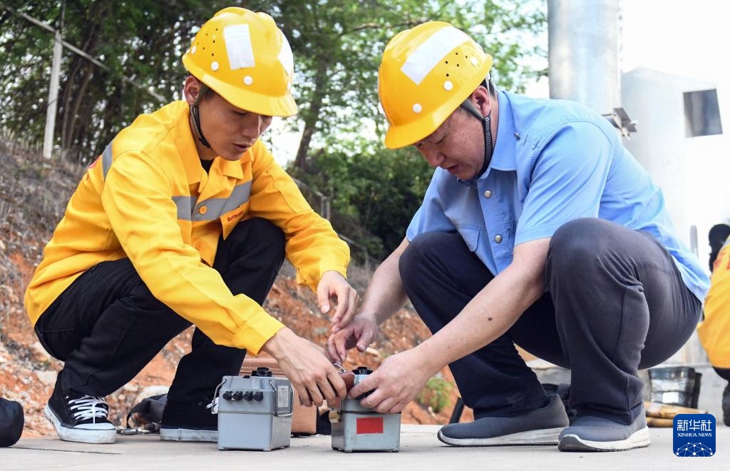 彭春林(右)在國鐵南寧局職工培訓(xùn)基地指導(dǎo)青年職工使用電極型接地儀測試卡(4月25日攝)。新華社記者 張愛林 攝