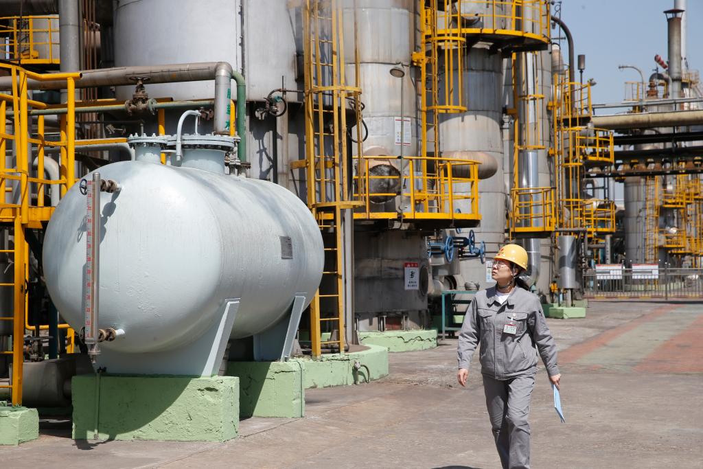 爬上十幾米高的塔架,鄧晶和同事開始進行巡檢工作。從她所處的位置眺望,整個甲醇裝置廠區盡收眼底——一個個巨大的反應爐,高聳的煙筒,還有各色復雜排列的管路。