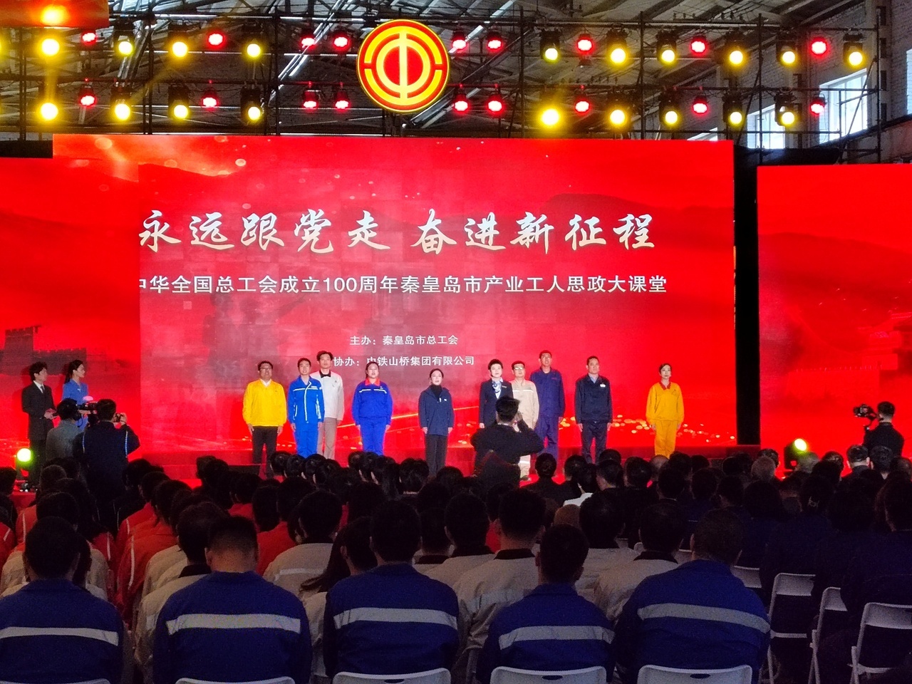“永遠跟黨走,奮進新征程!”4月28日上午,河北秦皇島市總工會主辦的“永遠跟黨走 奮進新征程 中華全國總工會成立100周年 秦皇島市產業工人思政大課堂”在中鐵山橋集團有限公司道岔車間舉行。來自全市的400余名勞模工匠、產業工人和工會工作者代表齊聚百年工業搖籃,大家精神飽滿、誓言錚錚,共享一場思想洗禮和精神淬煉。