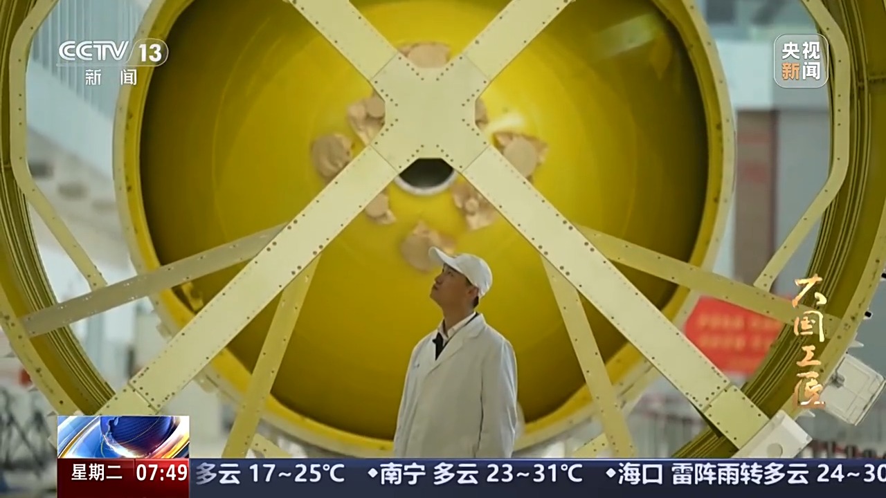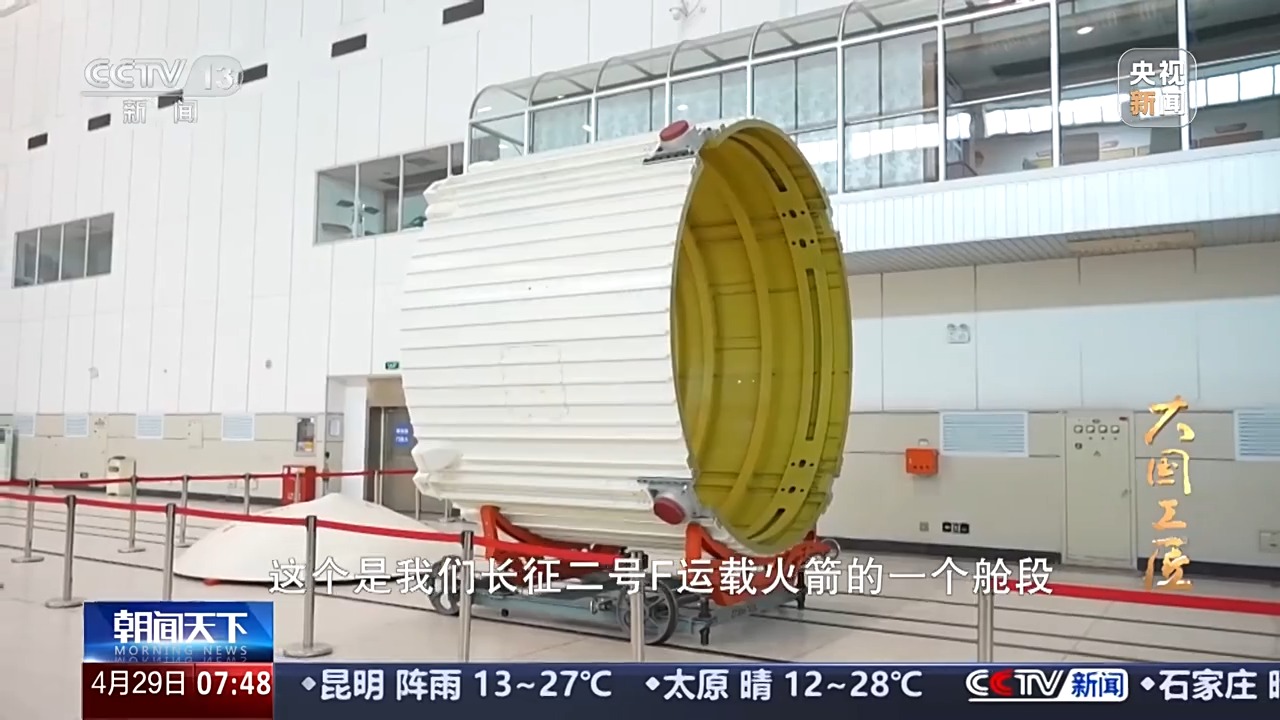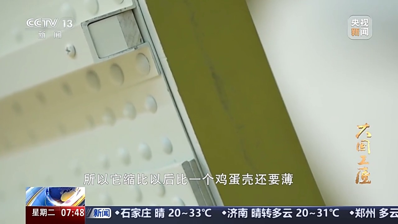 中國航天科技集團一院主任工藝師 劉爭:這個是我們長征二號F運載火箭的一個艙段,我們的火箭為了提高它的運載能力,都采用這種薄壁的設計結構,它的直徑有3米35,但是壁厚只有1毫米左右,所以它縮比以后比一個雞蛋殼還要薄。