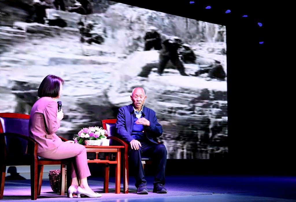 張買江(右)在紅旗渠干部學院向學員講述當年修渠的情景(2025年3月26日攝)。新華社記者 郝源 攝