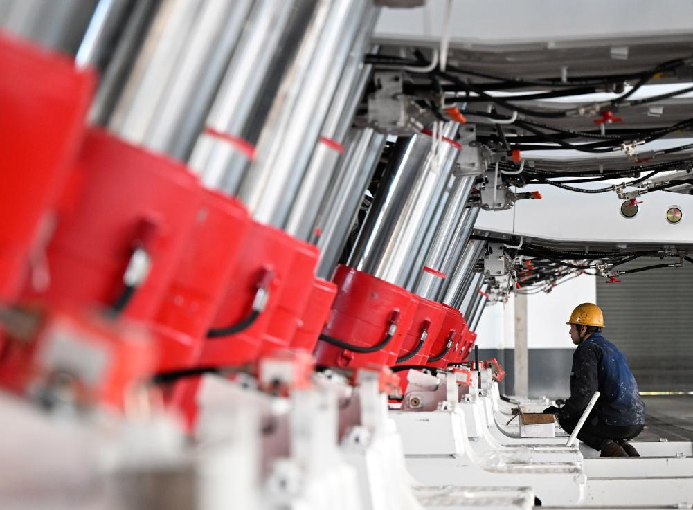 工人在林州重機集團股份有限公司液壓支架總裝車間進行安裝調試作業(2025年3月19日攝)。新華社記者 李嘉南 攝