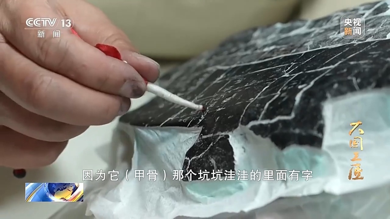 中國社會科學院考古研究所高級技師 何巧娟:因為它太脆了,弄不好就會傷到甲骨。太用力上墨會出現墨疙瘩,要是手勁輕了,甲骨文上的筆道又拓不清楚。拓甲骨要有敬畏心,因為保護甲骨就是保護歷史。