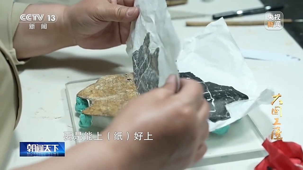 中國社會科學院考古研究所高級技師 何巧娟:甲骨本來是特大的一板字,上面有幾百個字,拓得非常漂亮,輪廓也清晰,字口也清晰,所有上面的字,全部都出來了,感覺可成功了。結果揭不下來,因為那時候用的是白芨水,跟甲骨粘在一起了。我那時候就想,要是能上紙好上、揭也好揭的話,那多好。