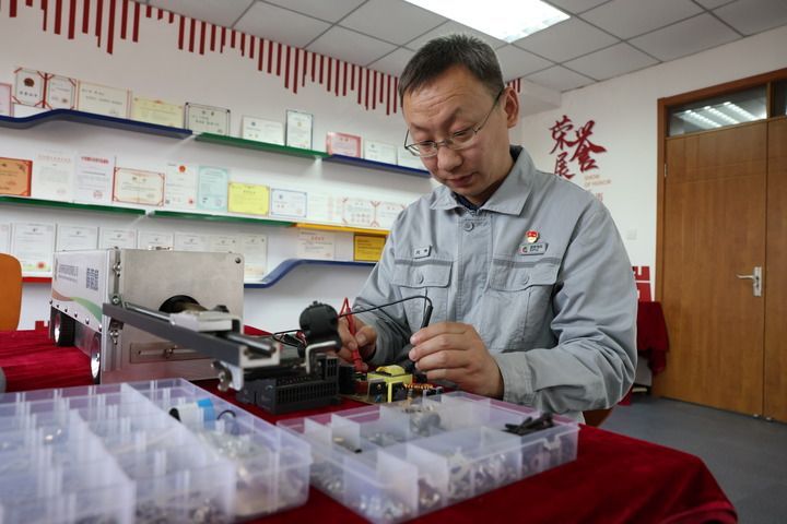 劉偉在創新工作室調試“霹靂鼠”線路板。(受訪者供圖)