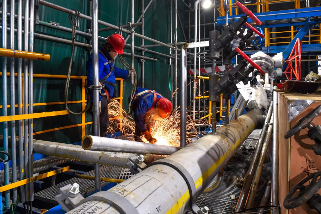 2月12日,工人在位于吉林省吉林市的中國石油吉林石化公司煉油化工轉型升級項目120萬噸/年乙烯裝置建設現場施工作業。新華社記者 許暢 攝