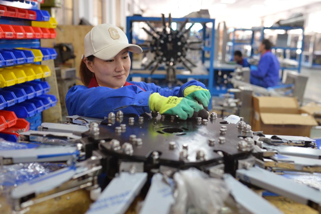 3月30日,在山東省青島市城陽區夏莊街道青島義龍裝備制造股份有限公司生產車間內,工人在組裝包裝機。新華社發(王海濱攝)
