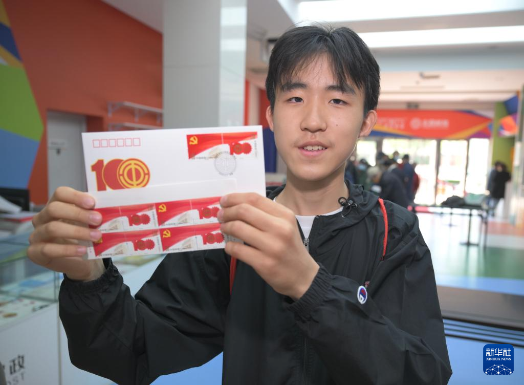 5月1日,在北京市朝陽區(qū)郵票公司,集郵愛好者展示剛買到的《中華全國總工會成立一百周年》紀念郵票。新華社記者 才揚 攝
