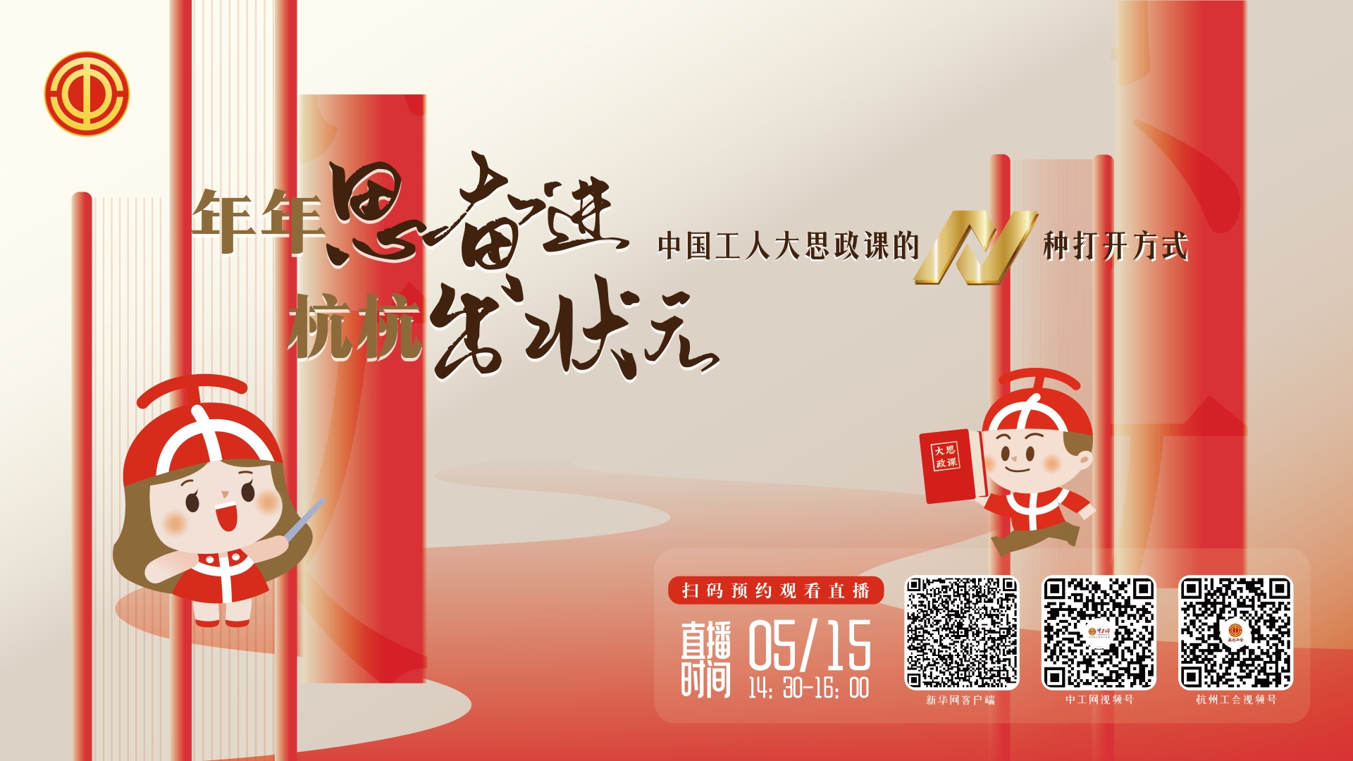 直播回顧|"年年思奮進 杭杭出狀元"—中國工人大思政課的N種打開方式??????在中華全國總工會成立100周年之際,杭州市總工會創(chuàng)新打造"中國工人大思政課"杭州模式。5月15日14:30,直播舉辦"中國工人大思政課"特色展示活動,中工網(wǎng)首頁、微博、視頻號同步播出。