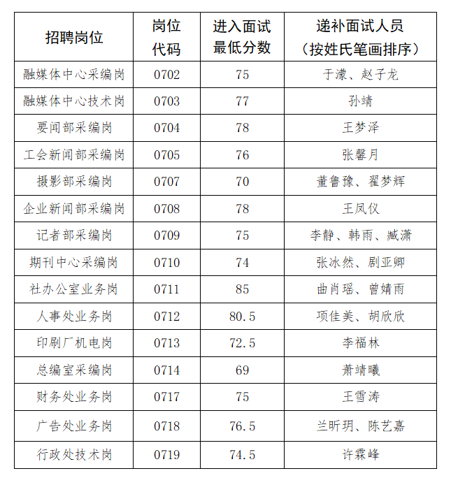 因有考生放棄面試資格,根據(jù)公開招聘工作有關(guān)規(guī)定,按照筆試成績從高到低的順序,從報考同崗位符合條件考生中,遞補面試人員23名。遞補面試名單如下。