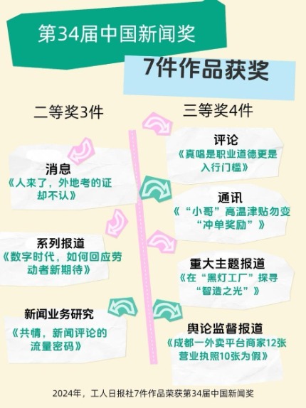 2024年,工人日報社7件新聞作品榮獲第34屆中國新聞獎,其中二等獎3件、三等獎4件。另有多件作品獲得“中國正能量網絡精品”“報業媒體助力全民閱讀優秀案例”“林草好新聞”“鐵路好新聞”“銀行業好新聞”“水利好新聞”等榮譽。