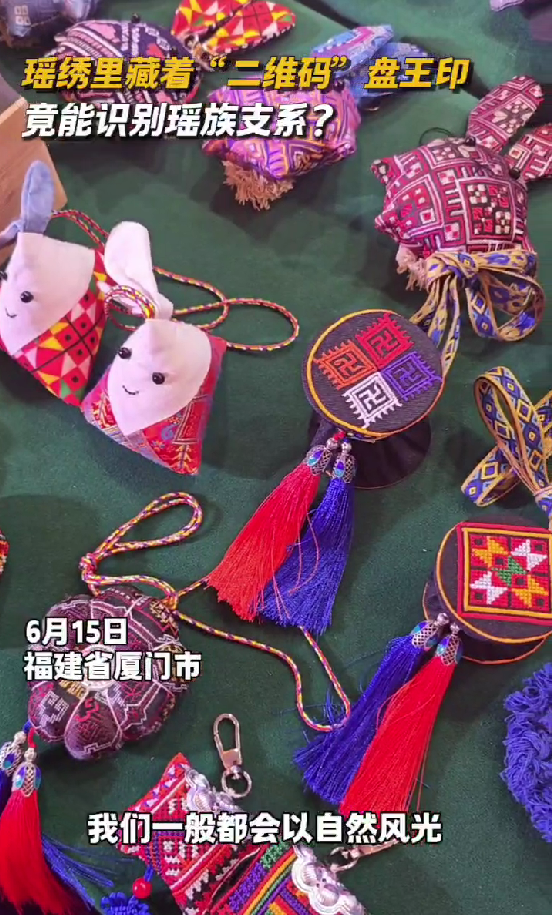 李素芳說:“瑤繡中的盤王印是瑤族一個比較重要的圖騰,相當于現(xiàn)在我們所說的‘二維碼’。看到身上穿戴的盤王印圖案,就可以知道是瑤族的哪個支系。而服裝上的工藝,主要是瑤族的挑花刺繡技藝,是源于瑤族婦女世代傳承的手工技藝,以山川花鳥或瑤族的神話傳說作為圖案,表達了對生活的熱愛和對自然的敬畏之情。”