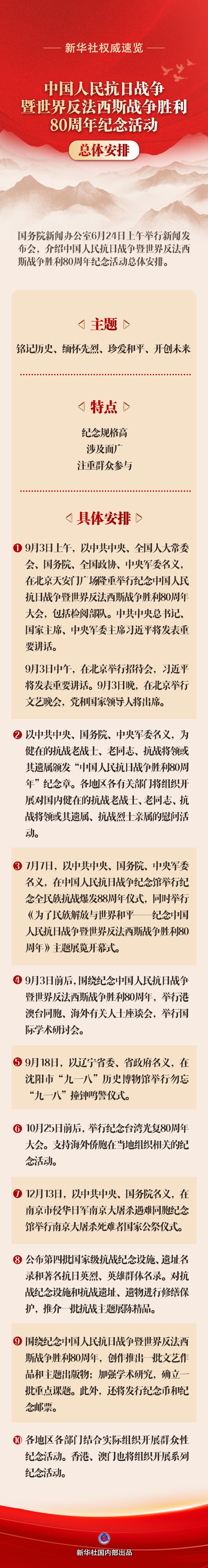 國務院新聞辦公室6月24日上午舉行新聞發布會,介紹中國人民抗日戰爭暨世界反法西斯戰爭勝利80周年紀念活動總體安排。這次紀念活動有哪些具體安排?一起來看↓