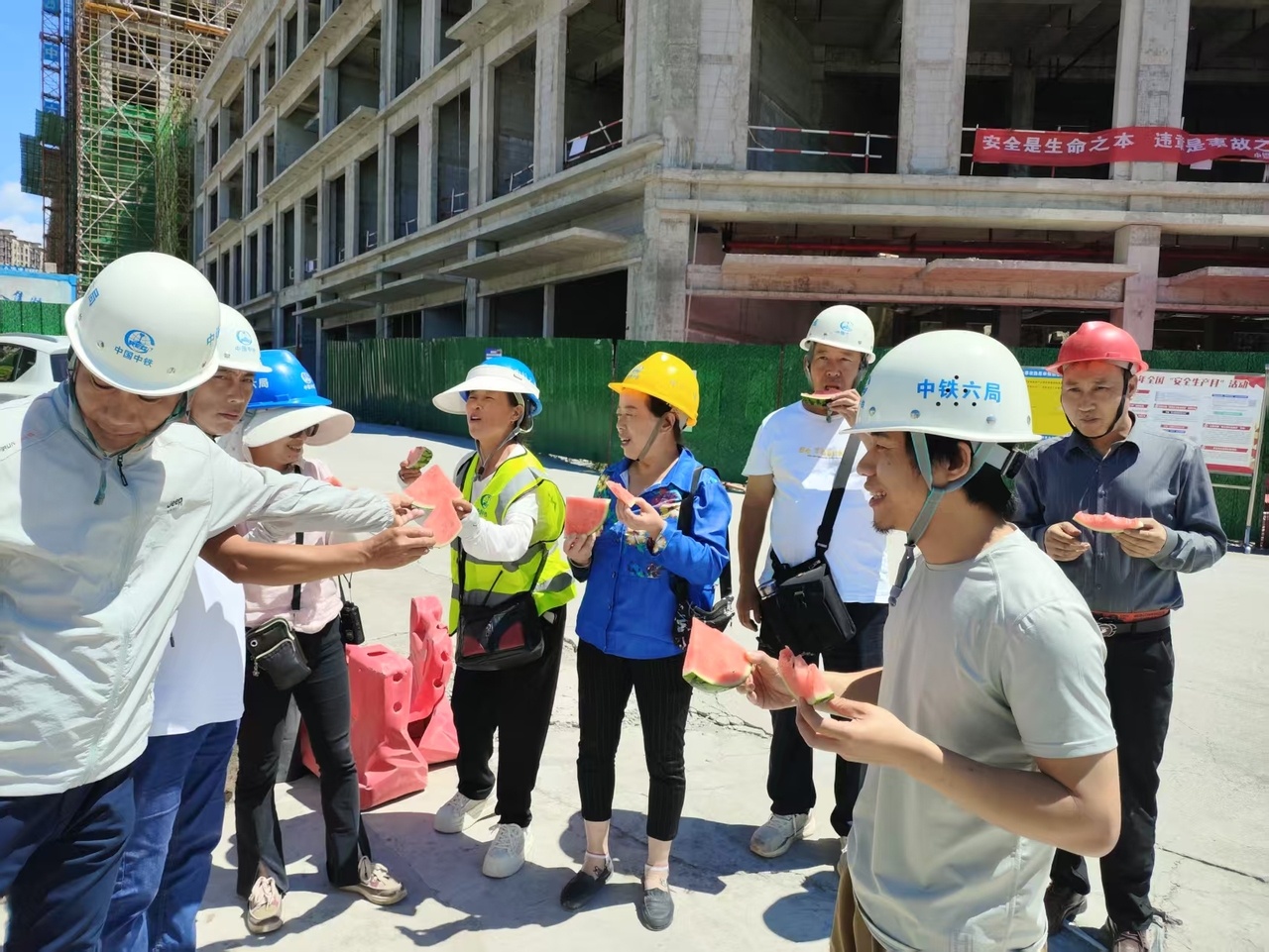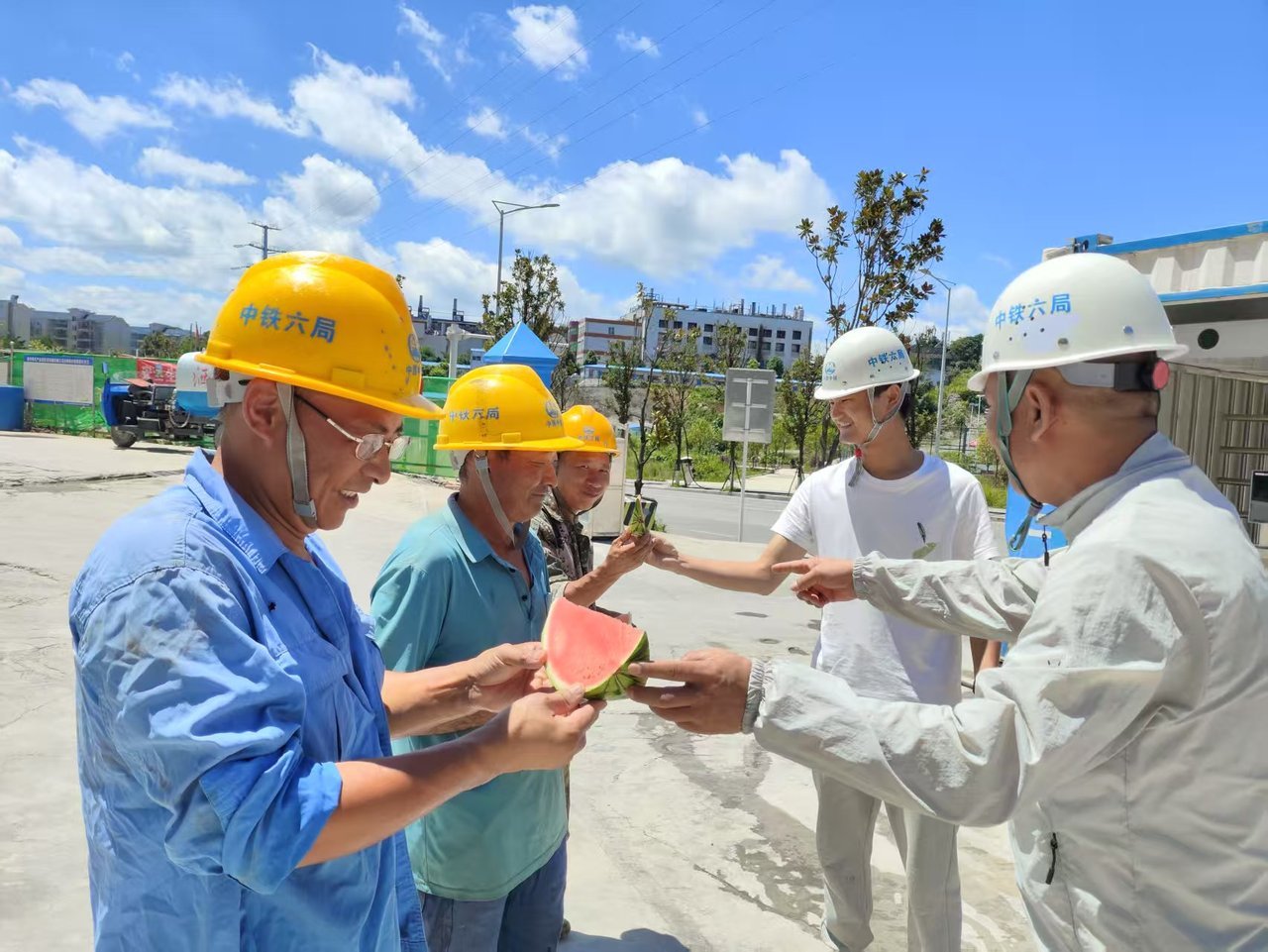 連日來,高溫天氣帶著灼人的勁兒,把整個(gè)城市裹得嚴(yán)嚴(yán)實(shí)實(shí),中鐵六局路橋公司雙龍項(xiàng)目部工會(huì)心系一線工人,將新鮮西瓜、飲用水以及藿香正氣水等防暑降溫用品送到工地。安全總監(jiān)郭新峰一邊給大家遞西瓜,一邊反復(fù)叮囑:“大家別著急,慢慢吃!高溫作業(yè)一定要注意安全,感覺不適馬上休息,咱們的飲用水和防暑藥品時(shí)刻備著!”