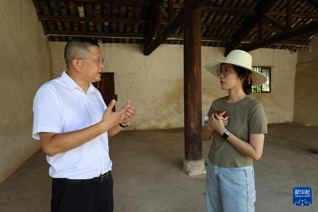 大悟縣革命傳統(tǒng)教育基地管理委員會副主任付波(左)在新四軍第五師國際招待所內(nèi)向記者講述歷史(7月21日攝)。新華社記者 朱唯希 攝