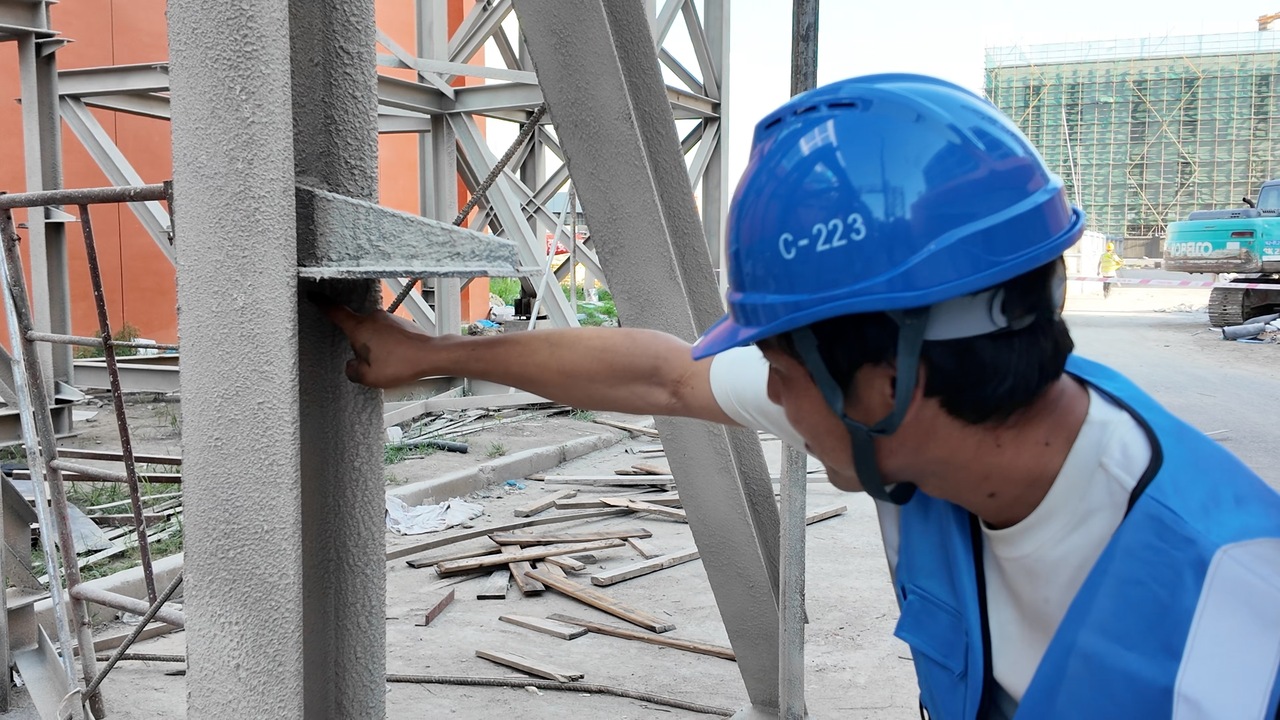 焊接是整個流程的關鍵一步。李作亭需要先確認兩根原料的組裝方式,用電焊做好標記,再交由焊工進行滿焊。“就像一場接力賽,我打好前站,他們穩住大局,少了誰都不行。”他笑著說。結構基本成型后,還要給半成品噴涂2至3層防火涂層。那些看起來像泥土塊的涂料,是保障建筑安全的重要屏障。不下雨時,工地的吊裝作業便會按計劃進行。“從加工廠送材料過來,到吊裝成型,整套流程下來少說也要一周。”