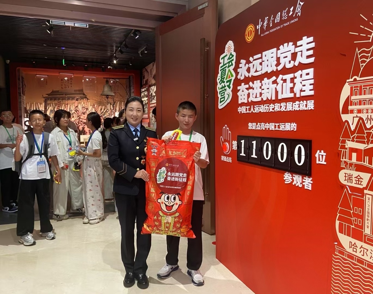 在長辛店二七紀念館和中國工人運動歷史與發展成就展,孩子們第一次系統地了解了中國工運史,并與全國勞模進行面對面交流。此外,黨的二十大代表、全國“最美公交司機”常洪霞現場向夏令營第11000位觀展小營員、來自寧夏中衛市的馬家駿贈送了“成長大禮包”。在百米長的勞模入黨志愿書墻前,常洪霞蹲下身,為孩子們講述了她如何用“一杯水”練就平穩駕駛功夫的故事,并鼓勵孩子們“握好人生的方向盤,系好信念的安全帶”。