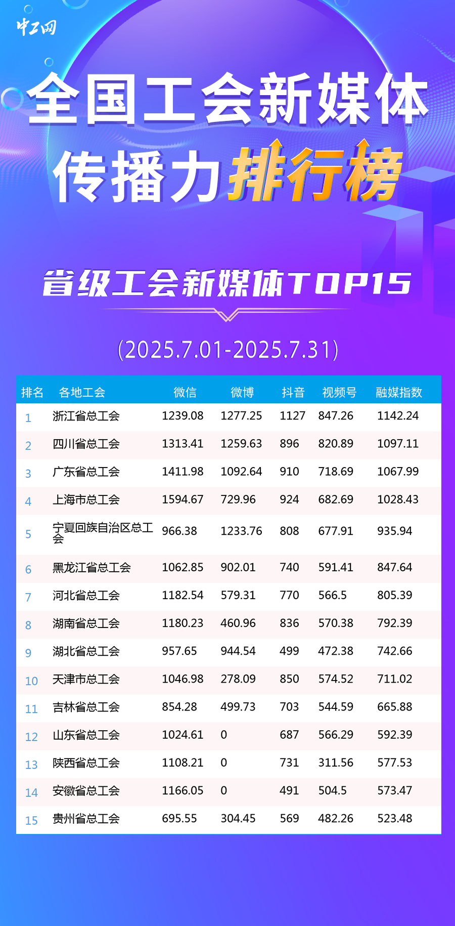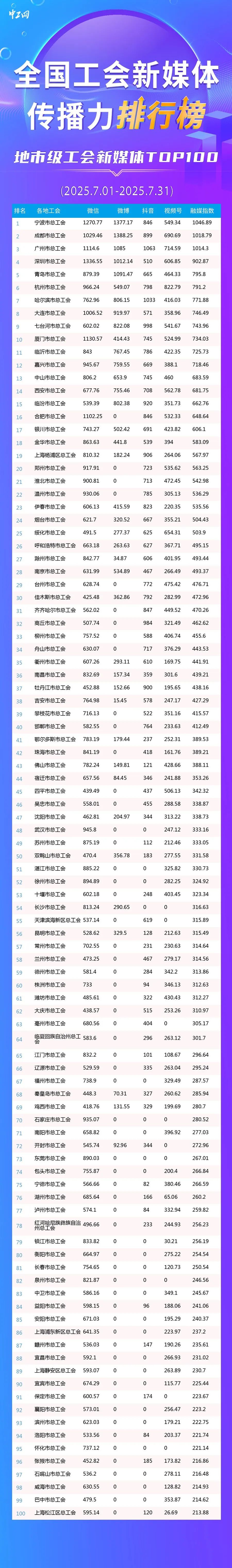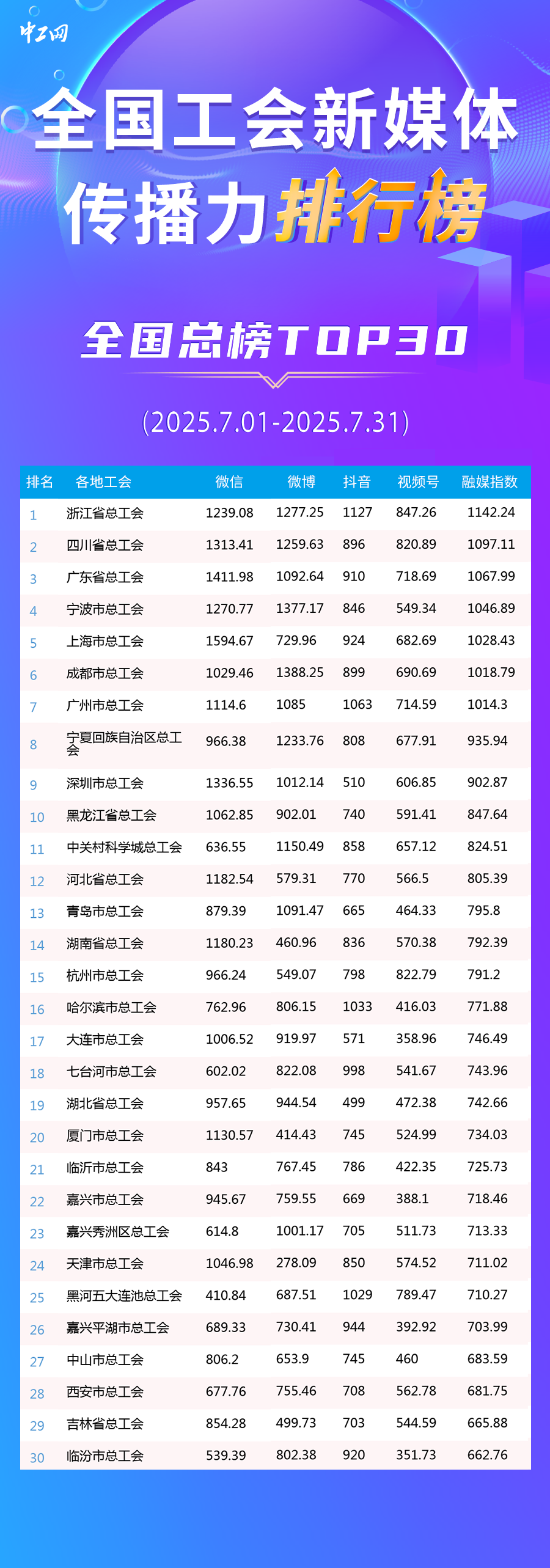 7月全國工會新媒體傳播力排行榜全國總榜TOP30