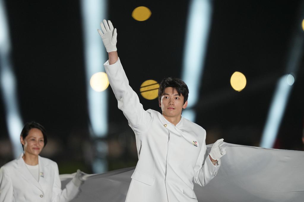 8月7日,國際奧林匹克委員會會旗執旗手潘展樂在開幕式上。新華社記者 劉坤 攝
