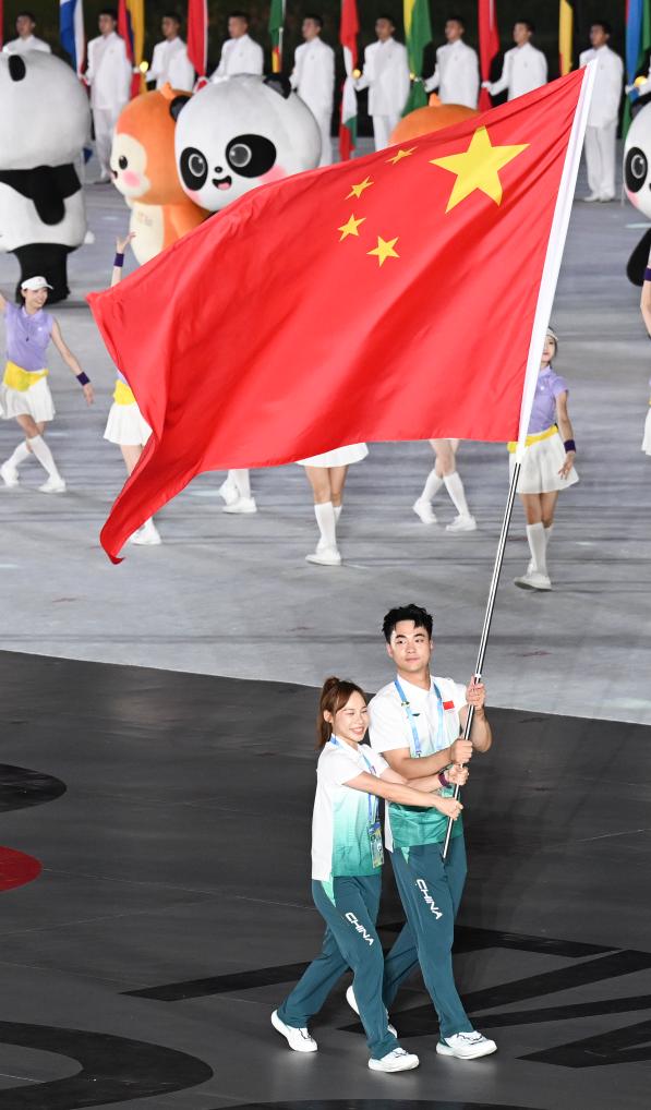 8月7日,成都世運會組委會會旗執旗手張雨霏在開幕式上。新華社記者 劉坤 攝