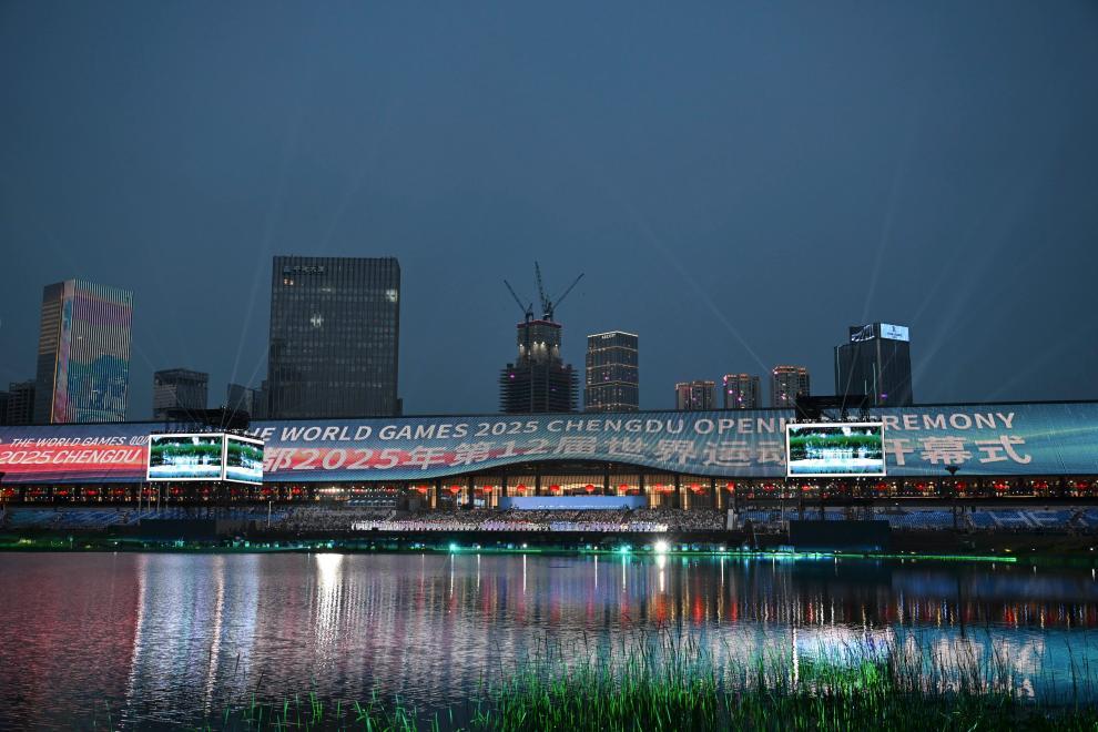 “天府之檐”上,往屆世運會的會徽、海報與運動員的笑臉,輪番在大屏上閃現。世界名曲與奧運歌曲編織成的背景音樂,喚醒人們共同的美好記憶。觀眾席上,掌聲陣陣,此起彼伏。