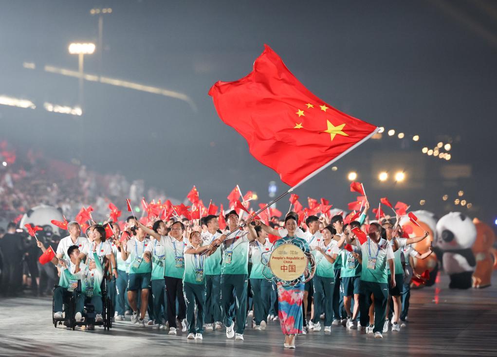 女子輪滑運動員郭丹和男子技巧運動員史經緯執旗,中國代表團步入會場,489人的規模創歷屆之最,其中包括10名殘疾人運動員。這也是中國隊歷史上首次派出殘疾人運動員參賽。